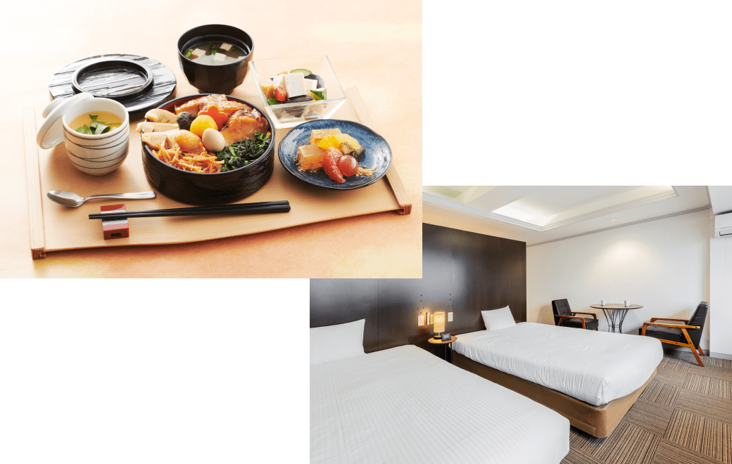 全客室24㎡以上、バス・トイレはセパレートタイプ。また、お食事はホテルシェフ特製のものをご用意いたします。