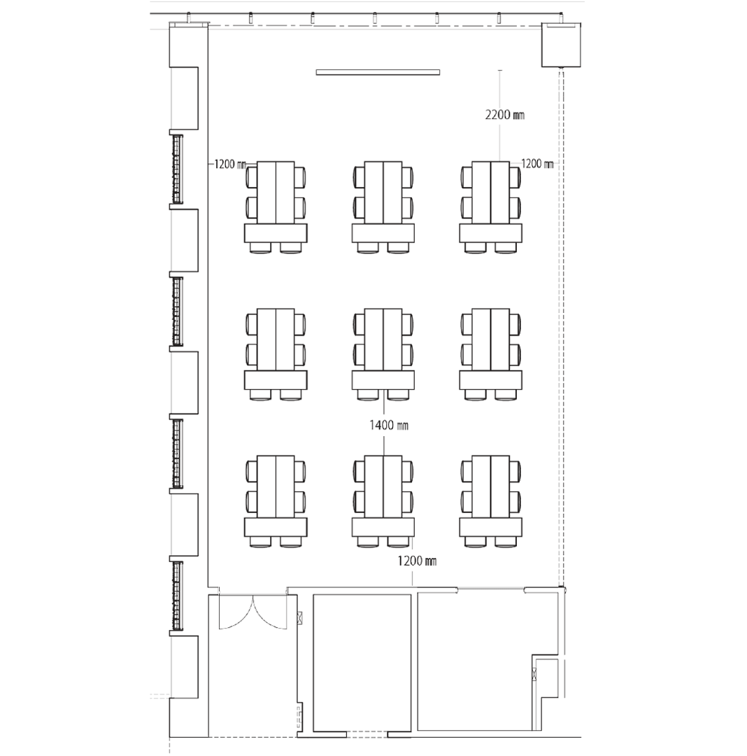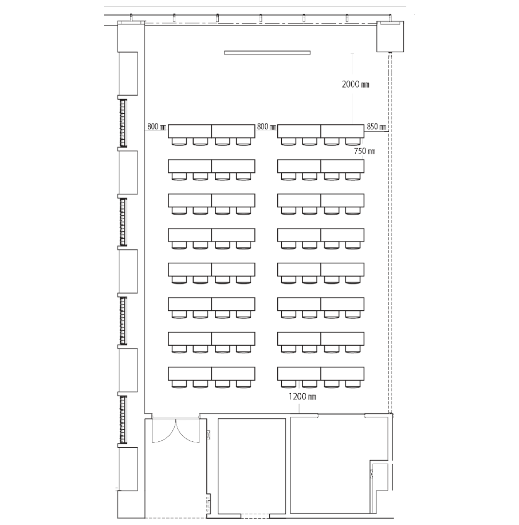 スクール形式では64席、島型では54席、ロの字型で36席の設置が可能です。