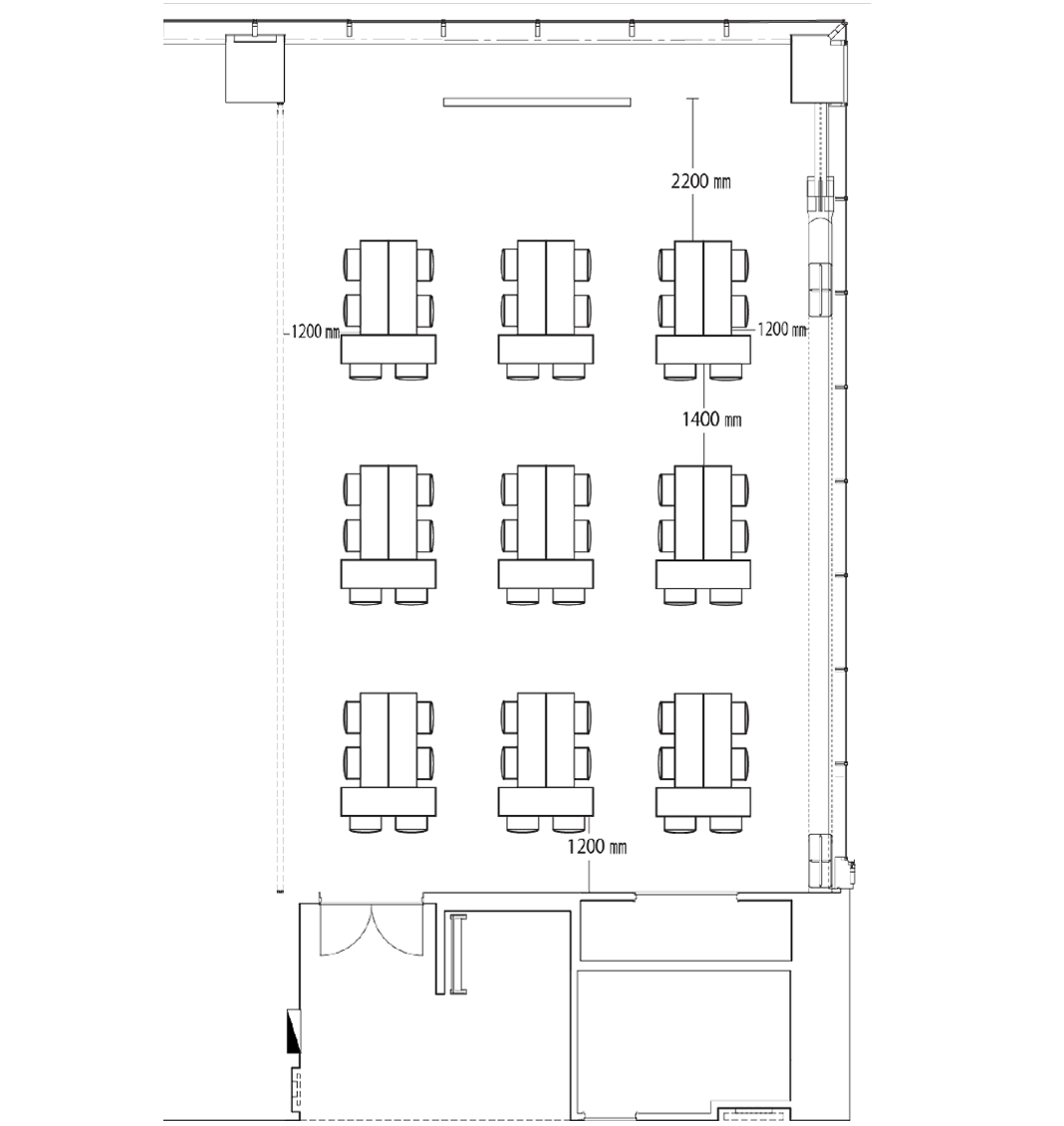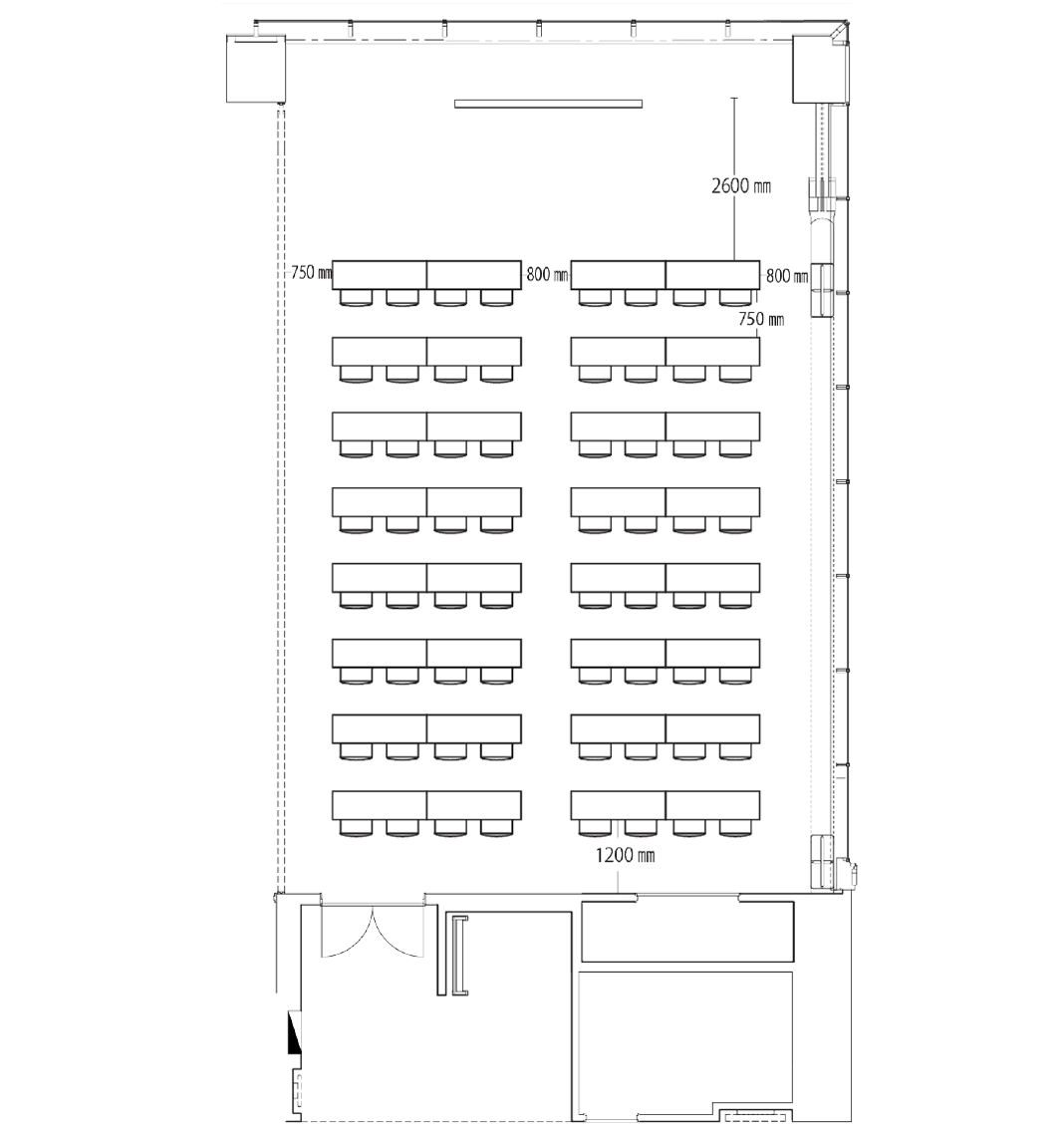 スクール形式では64席、島型では54席、ロの字型で36席の設置が可能です。