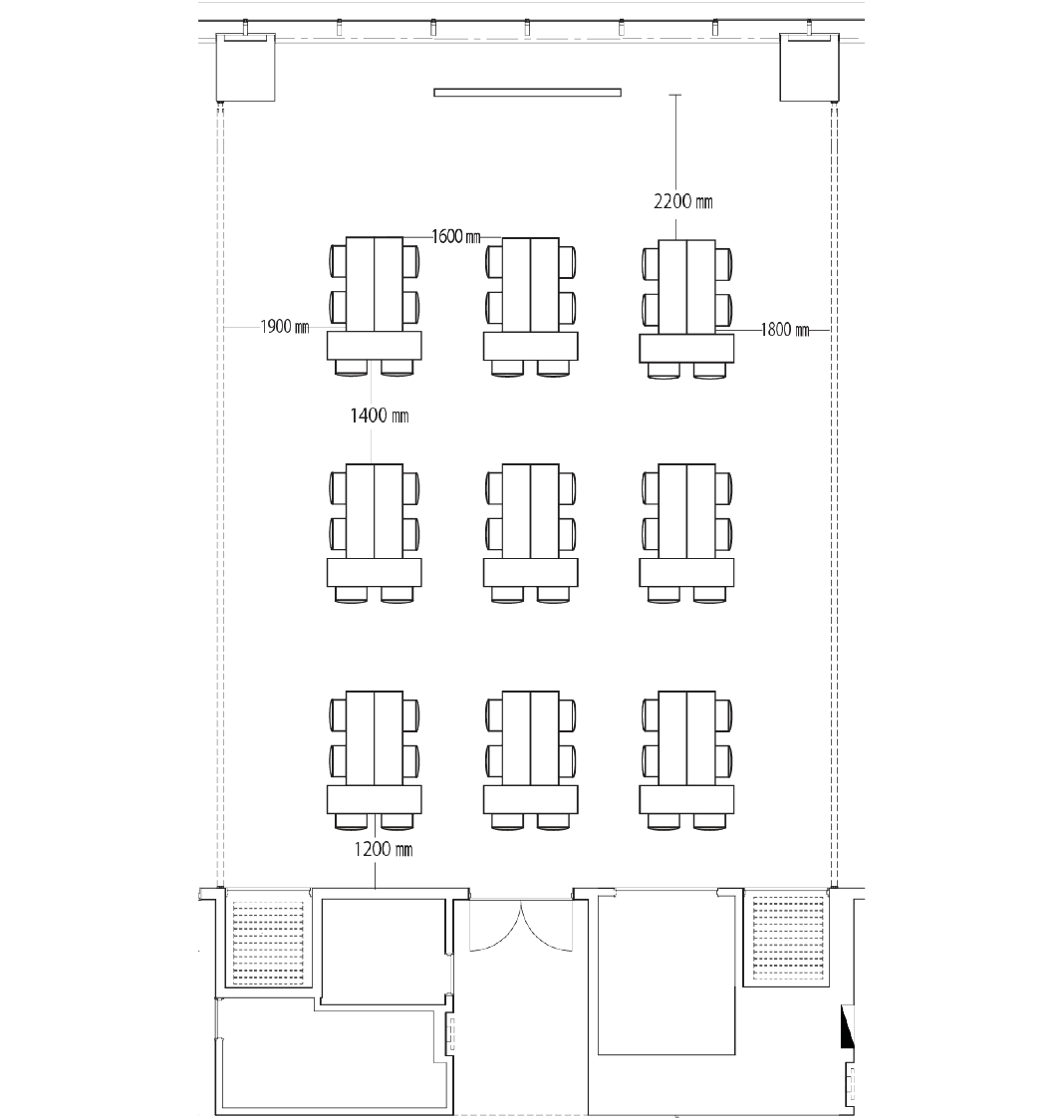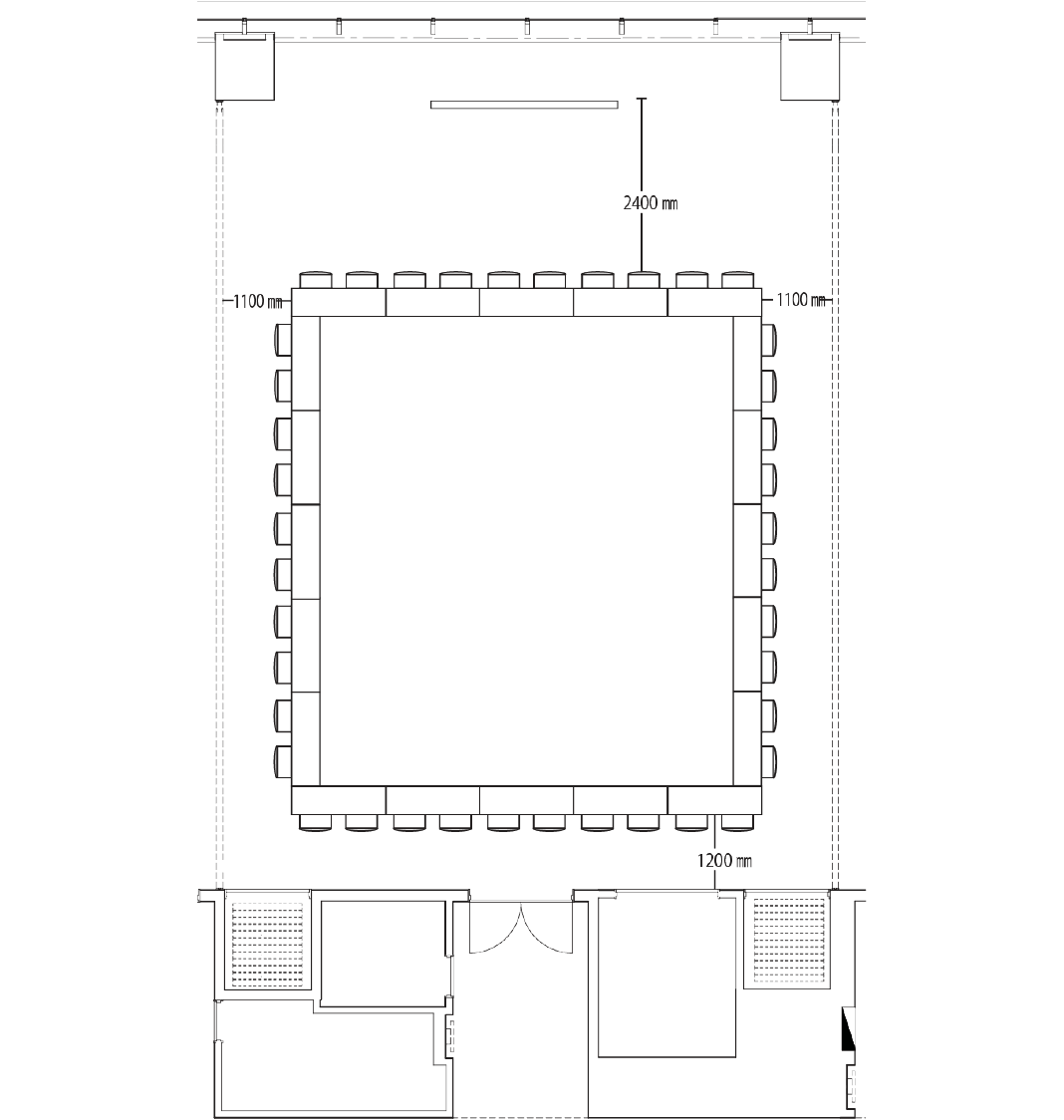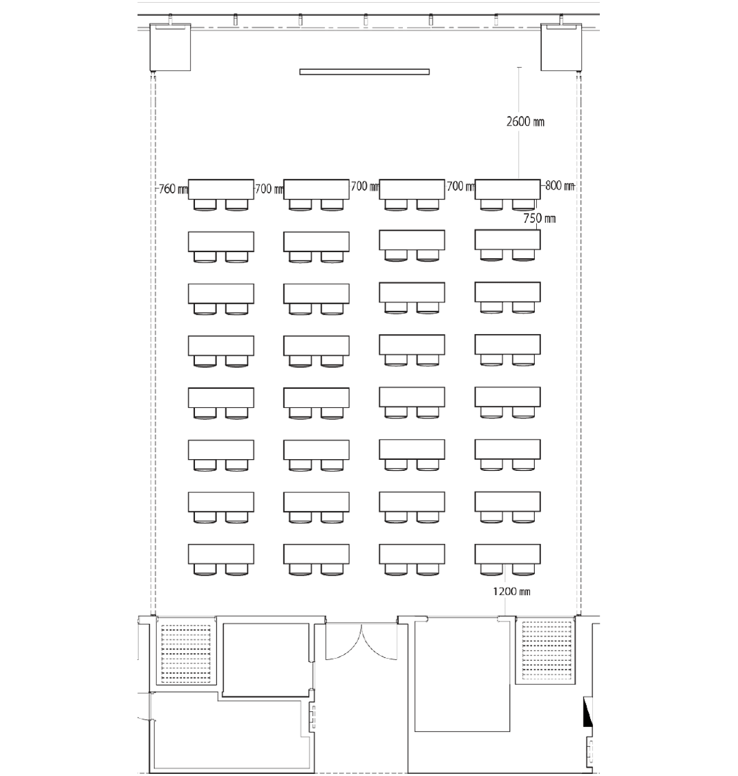 スクール形式では64席、島型では54席、ロの字型で40席の設置が可能です。
