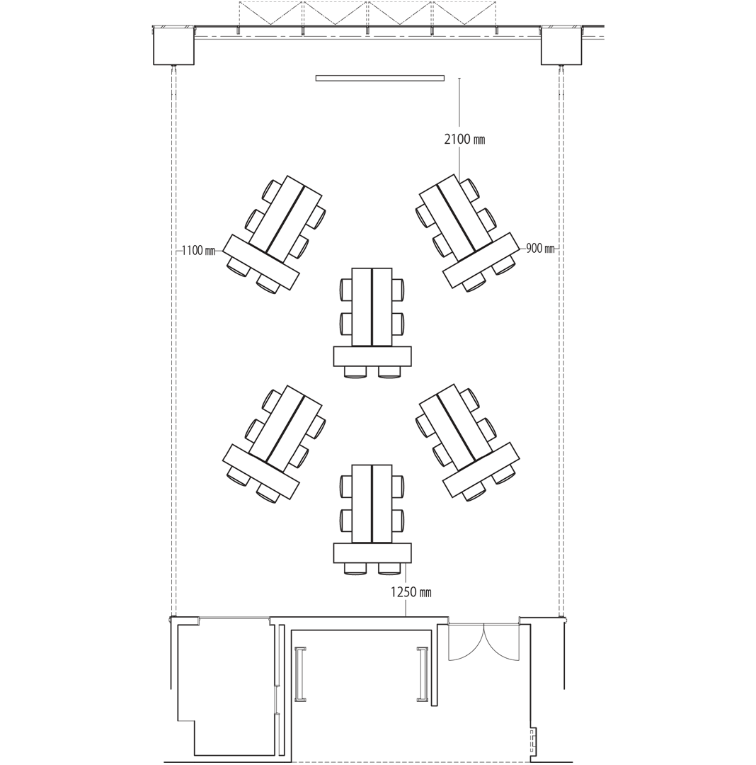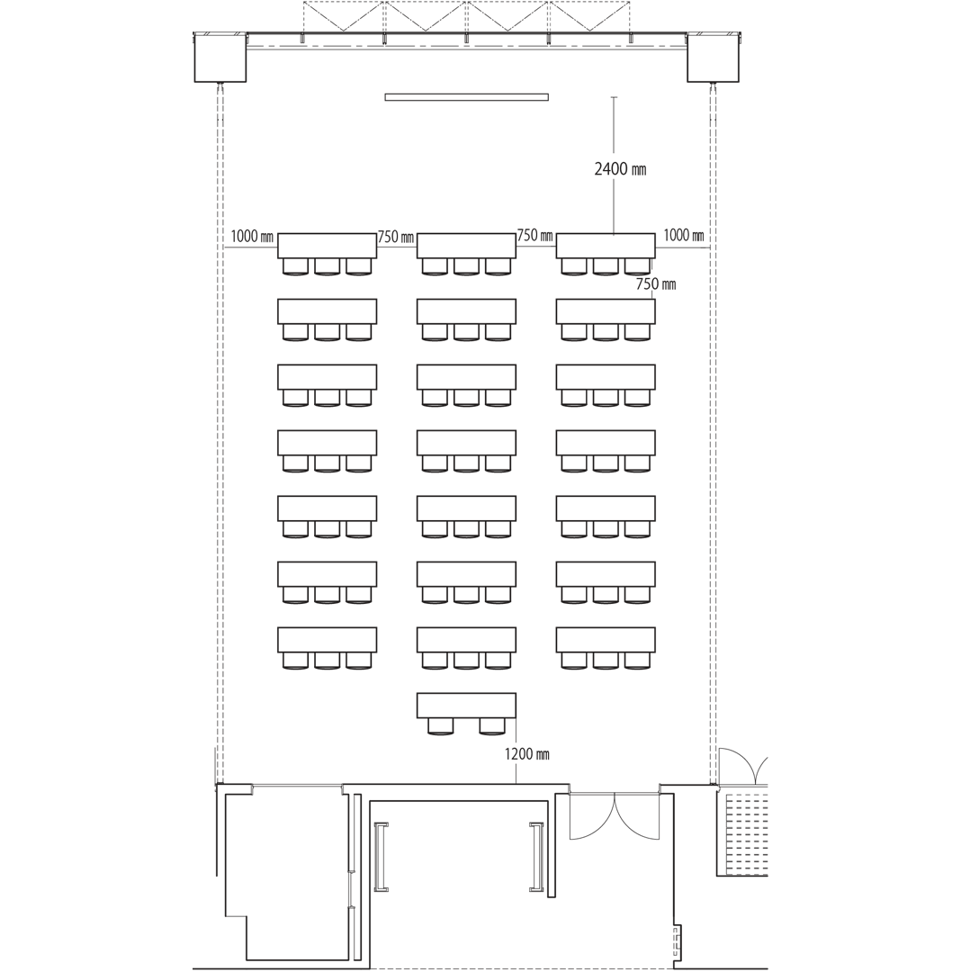 スクール形式では65席、島型では36席、ロの字型で32席の設置が可能です。