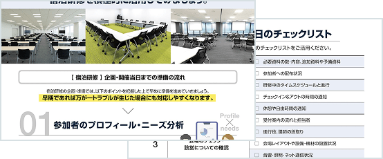 施設の研修支援スタッフが充実しているか確認します。専任のコンシェルジュがプログラム作成から運営までサポートしてくれるか、問い合わせ対応がスムーズかといった点も選択基準です。